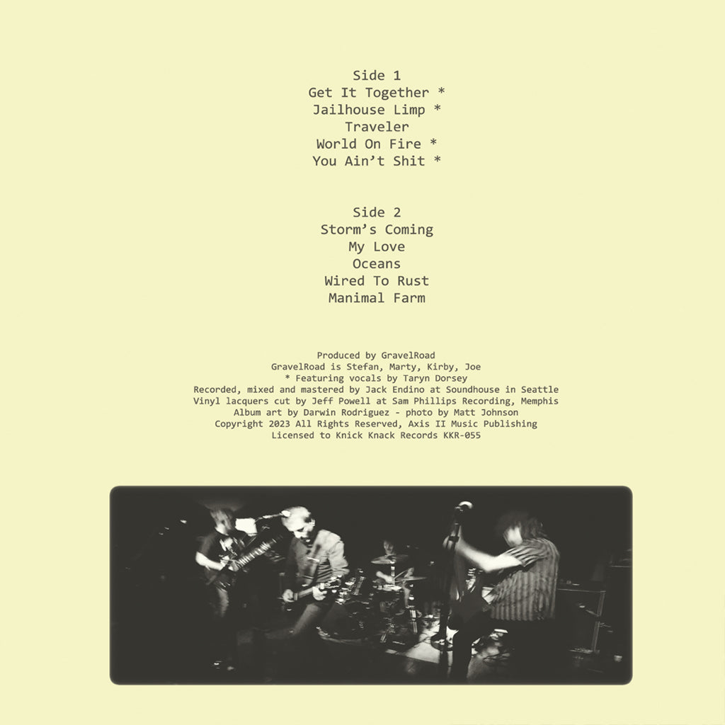 Released in 2023, Duty To Warn is the ninth studio album from GravelRoad. The album was recorded, mixed and mastered by Jack Endino at Soundhouse in Seattle. The vinyl lacquers were cut by Jeff Powell at Sam Phillips Recording in Memphis.