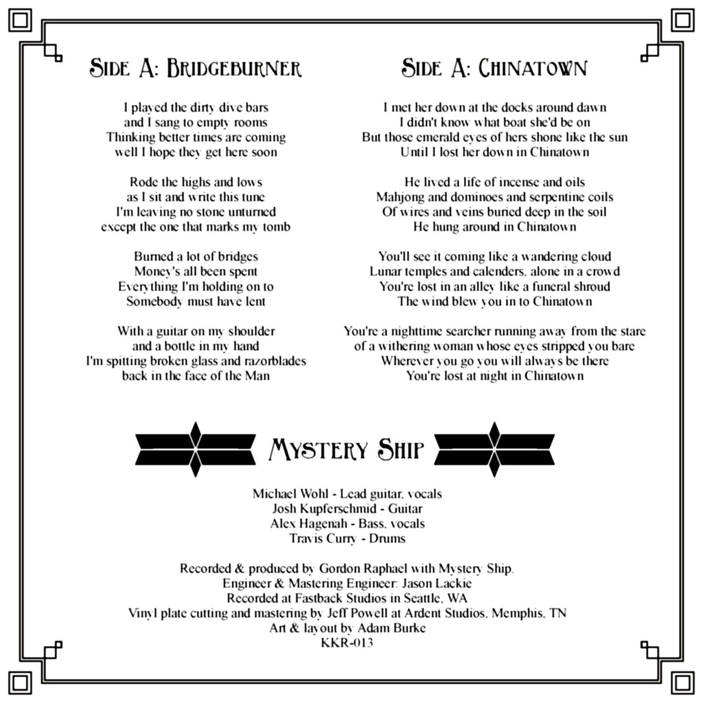 Released in 2013, Bridgeburner b/w Chinatown was recorded and produced by Gordon Raphael at Fastback Studios in Seattle. Vinyl lacquers cut by Jeff Powell at Ardent Studios in Memphis. Art and design by Adam Burke.